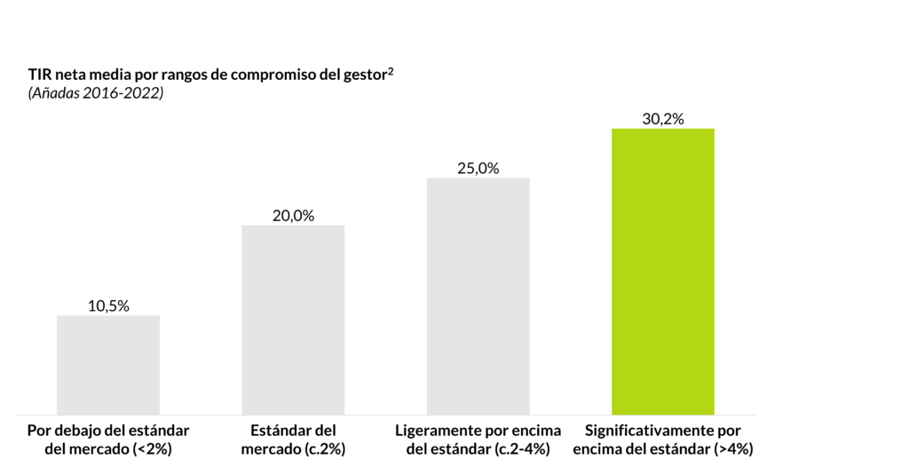 Como se puede ver en el gráfico anterior, los fondos en los que el equipo del gestor comprometió menos del 2% del tamaño del fondo (por debajo del estándar de mercado) tuvieron un desempeño inferior en comparación con aquellos donde el equipo aportó un porcentaje mayor, logrando una TIR neta de aproximadamente 11%. Los fondos en los que los gestores comprometieron cerca del 2% del tamaño del fondo alcanzaron un TIR neta promedio del 20%, mientras que aquellos que contribuyeron más del 4% lograron un retorno promedio del 30%. Los datos demuestran la clara relación entre los compromisos del gestor y los retornos obtenidos por los fondos. Al proporcionar capital para financiar el compromiso de los GPs, los préstamos a la gestora pueden fortalecer la alineación de intereses con sus inversores y, en consecuencia, aumentar la predictibilidad de alcanzar mayores retornos.
