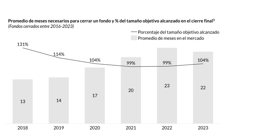 El entorno de fundraising se ha vuelto cada vez más desafiante en los últimos años. El tiempo promedio para cerrar un fondo ha aumentado significativamente, de 13 meses en 2018 a 22 meses en 2023, lo cual resulta en un incremento del 70%. Al mismo tiempo, el porcentaje promedio del tamaño objetivo logrado por los fondos ha disminuido en 27 puntos porcentuales. Estos retos subrayan la necesidad de que los gestores presenten ofertas más atractivas a los inversores para acelerar y lograr sus actividades de fundraising.