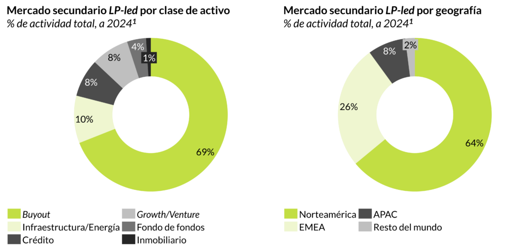 Si segmentamos esta actividad secundaria de inversores, vemos que está particularmente concentrada en los sectores de buyout dentro del private equity en términos de clase de activo, y en Norteamérica en términos geográficos. No obstante, el resto del mercado también está bastante activo y en crecimiento, con un aumento de la actividad en otras clases de activo como inmobiliario, crédito y venture capital. El mercado secundario europeo también es muy dinámico y está ganando importancia.