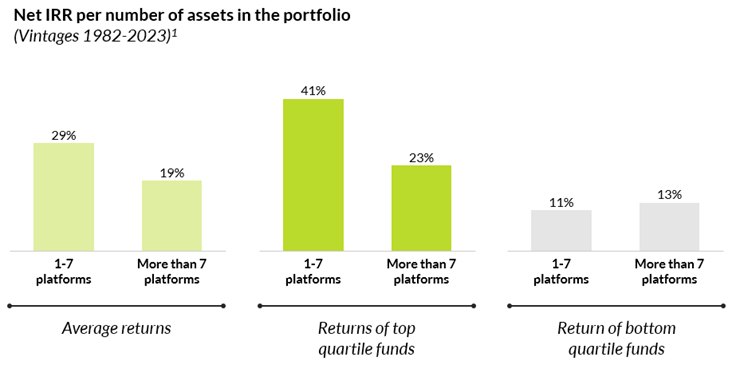Historically, fund managers with more concentrated portfolios tend to have higher average returns than those who are more diversified. Funds with 1-7 assets have historical average net IRRs of c.29%, whereas funds with more than 7 assets have average net IRRs of c.19%. The difference in returns between concentrated and diversified portfolios is further exacerbated in top quartile funds. Top quartile funds which have 1-7 assets have historical net IRRs of c.41%, however top quartile funds with more than 7 assets have an IRR of 23%.