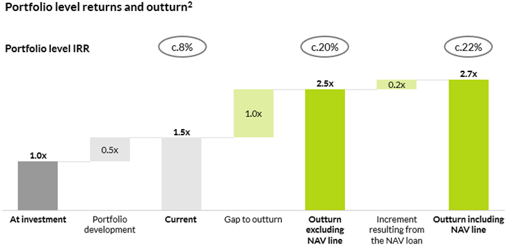 To execute this transaction, the fund is exploring using an NAV loan. This would enable the fund to employ the collective value of its existing portfolio as collateral, securing more favorable financing terms. NAV lending would offer a significantly lower cost of capital compared to other financing alternatives, such as mezzanine loans and allow the fund to carry out the acquisition without diluting its existing equity holdings. Using the NAV loan, the fund can invest in the new platform and increase the fund’s overall outturn to 2.7x gross MoC.