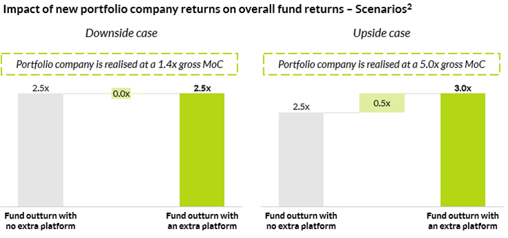 On the other hand, in a scenario where the new platform outperforms its expectations, it can be highly value-additive towards the fund’s overall returns. For instance, assuming an exit at a c.5.0x MoC, the funds’ overall returns increase to 3.0x MoC. Thus, NAV financing can offer the potential for significant return uplift while effectively mitigating the risks typically associated with underperforming investments and concentrated portfolios.