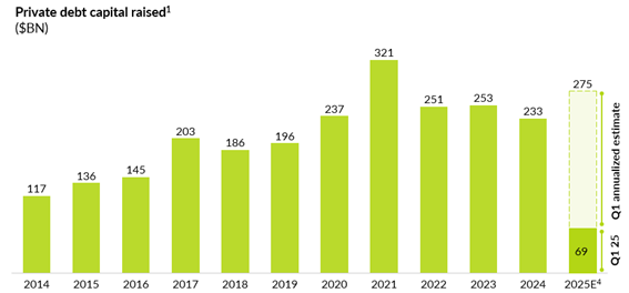 The chart below illustrates how capital raised by private debt funds has grown significantly over the past decade. While fundraising volumes moderated between 2022 and 2024, this trend is consistent with broader patterns seen across alternative asset classes, as higher interest rates and macroeconomic uncertainty led some investors to pause or rebalance their portfolios. However, the structural case for private credit remains strong and early data from Q1 2025 shows encouraging fundraising activity, suggesting a potential rebound as market conditions stabilize and demand for private lending solutions persists.