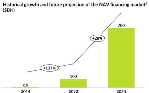 As shown in the chart below, the NAV financing market has grown from a relatively small base to over $100 billion by 2022, reflecting how managers have increasingly adopted this tool. Looking ahead, the NAV financing market is projected to grow 7x between 2022 and 2030, from $100 billion to $700 billion, representing a c.28% CAGR, making it one of the fastest-growing segments within private credit. Additionally, other new fund finance tools are emerging and growing in adoption and popularity, including hybrid loans, continuation fund loans and bridging loans. Furthermore, fund finance providers are also starting to provide financing to GPs through Management company loans.
