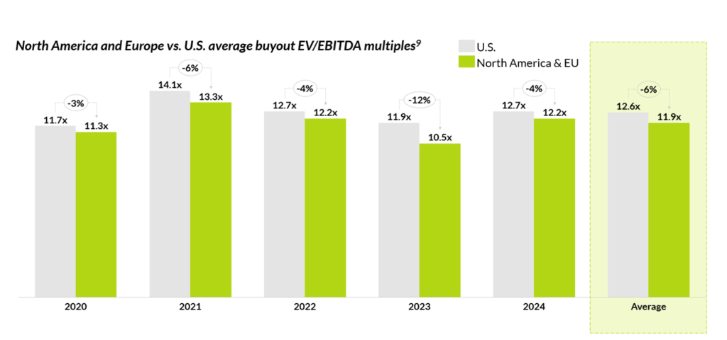 Thanks to the lower private market saturation, valuations for assets tend to be more conservative in Europe than in the U.S. On average, there is a c.6% discount between European and other North American assets (excl. U.S.) relative to U.S. assets. This valuation gap allows European managers to purchase higher quality assets at similar prices.